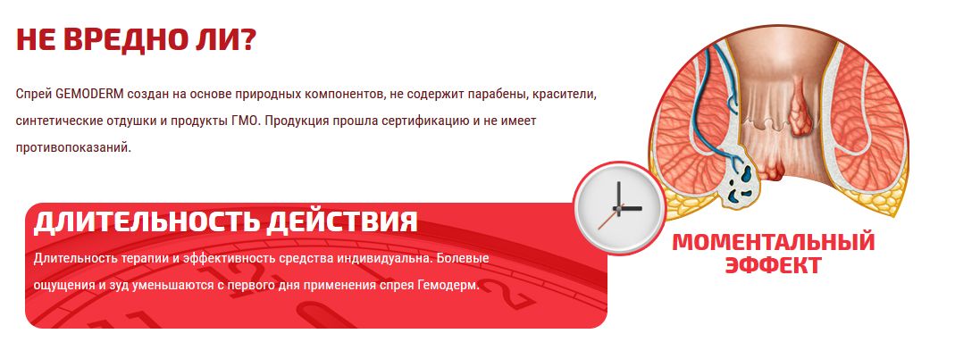 Спрей Gemoderm производится в соответствии с запатентованной формулой и рекомендуется при лечении послеродового геморроя в силу следующих трёх факторов: